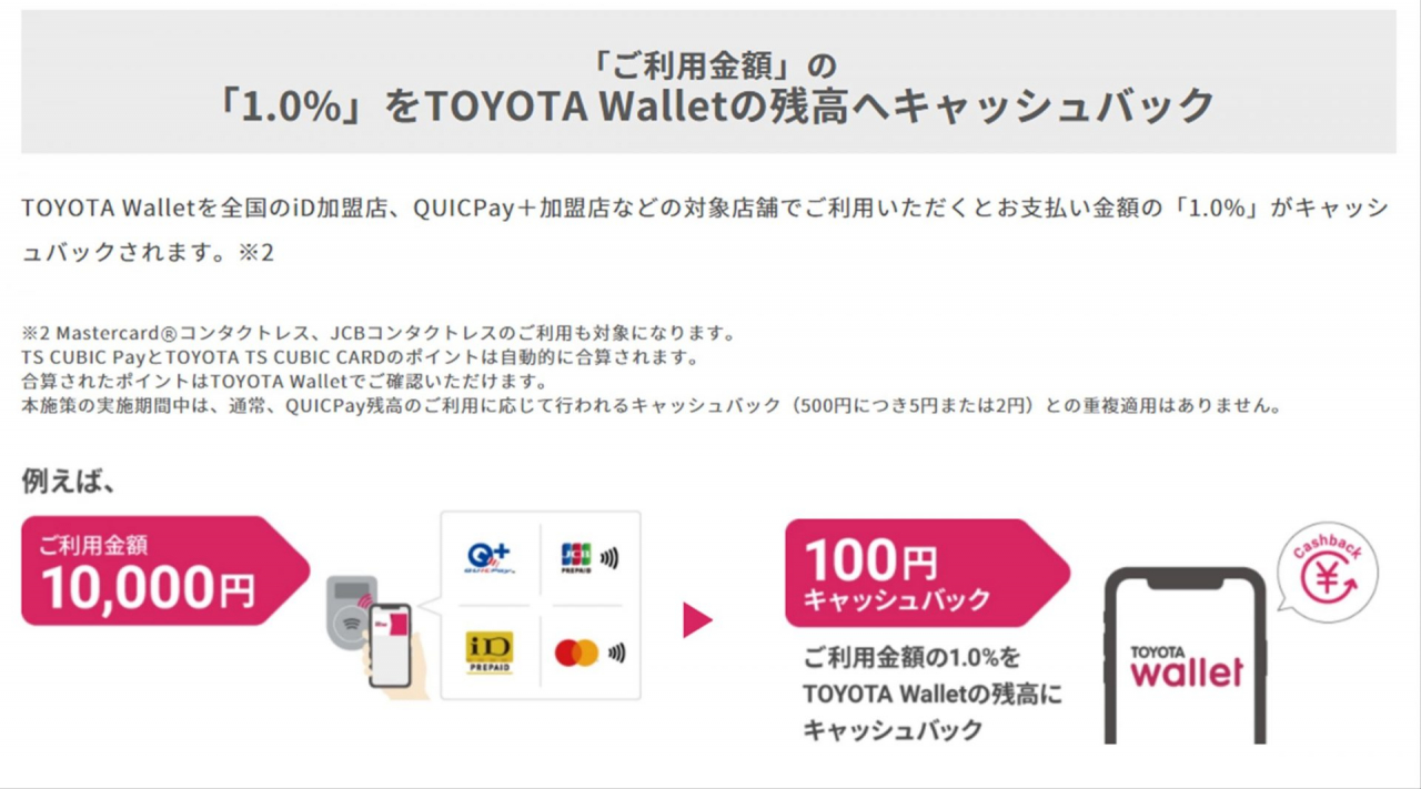 10月末に「TOYOTA Wallet」の1.5%還元が終了し、代わりに「毎日毎回2.0%還元」キャンペーンがスタートしました。内容を簡単にまとめると以下のとおりです。