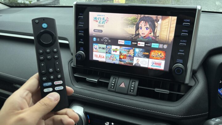 私の場合は、車のグローブボックスに投げ入れておきました。手前にFireTVのリモコンが見えると思いますが、これに匹敵するサイズです。